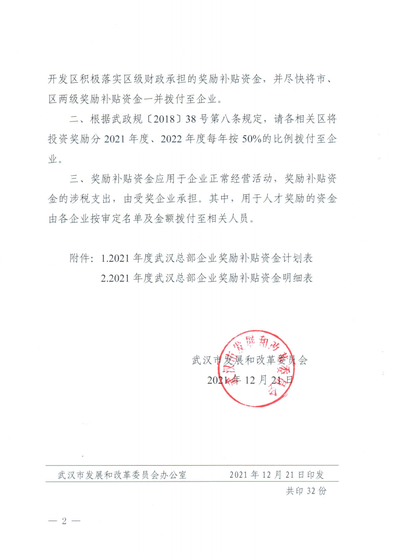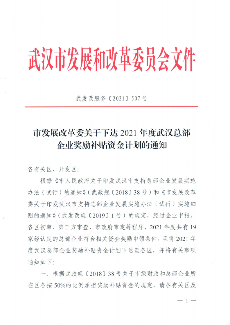 市發展改革委關于下達2021年度武漢總部企業獎勵補貼資金計劃的通知